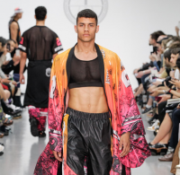 The quintessential Astrid Andersen man recently returned from Japan, where he finished a two-week intensive training course in the ancient art of Sumo wrestling. Moving East and beyond from America’s basketball courts, AA has maintained his athletic idiosyncrasy (nylon textures and practical sweat pants are still at the core of his wardrobe), but integrated quite a bit of delicate floral prints for a gender-flexible summer vibe. Nonetheless, AA starts his day with 50 push-ups in his sunrise-brocade kimono, while listening to a slow-downed version of TLC’s “Creep.” For obvious reasons, his favorite artist is Fatima Al Qadiri, who he plays repeatedly on his iPad Mini. AA has come to terms with the fact that ‘sport’ is an aesthetic activity as much as it is a physical one; rather than posing for the NBA trials, he is subverting notions of masculinity by wearing crop tops to the gym.