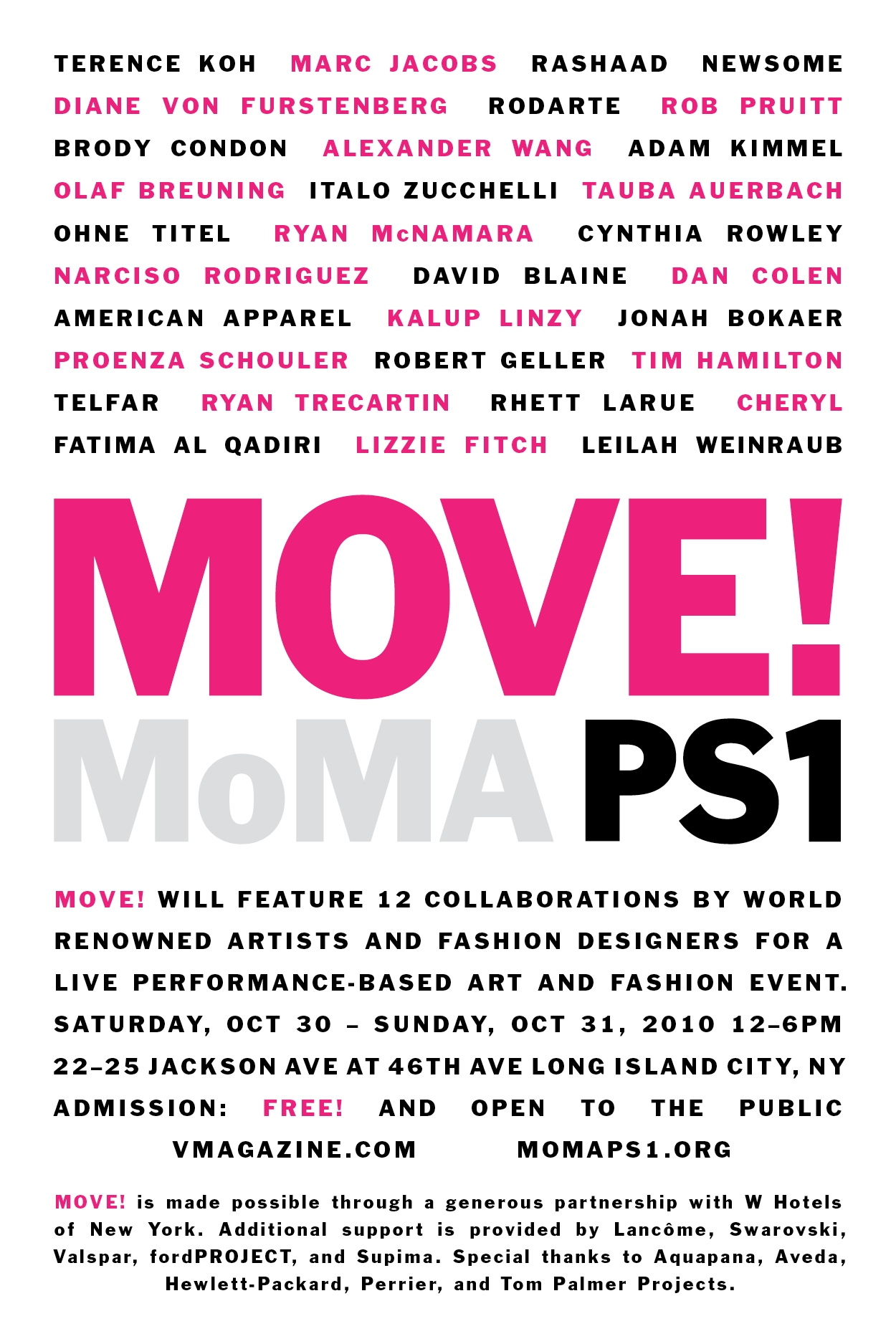 Artists and designers in PS1’s MOVE! include: Kalup Linzy and Diane Von Furstenberg; Rob Pruitt and Marc Jacobs; Terence Koh and Italo Zucchelli (Calvin Klein Collection); Tauba Auerbach and Ohne Titel; Olaf Breuning and Cynthia Rowley; Brody Condon and Rodarte; Rashaad Newsome and Alexander Wang; Dan Colen and Proenza Schouler; David Blaine and Adam Kimmel; Jonah Bokaer and Narciso Rodriguez; The Cheryls and American Apparel; and Ryan McNamara and Robert Geller