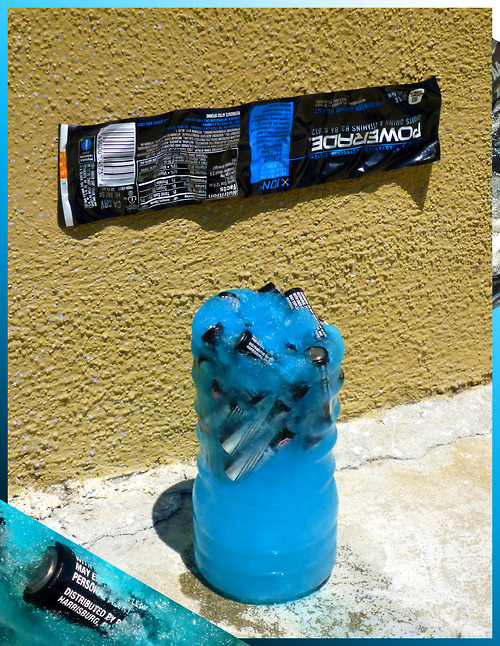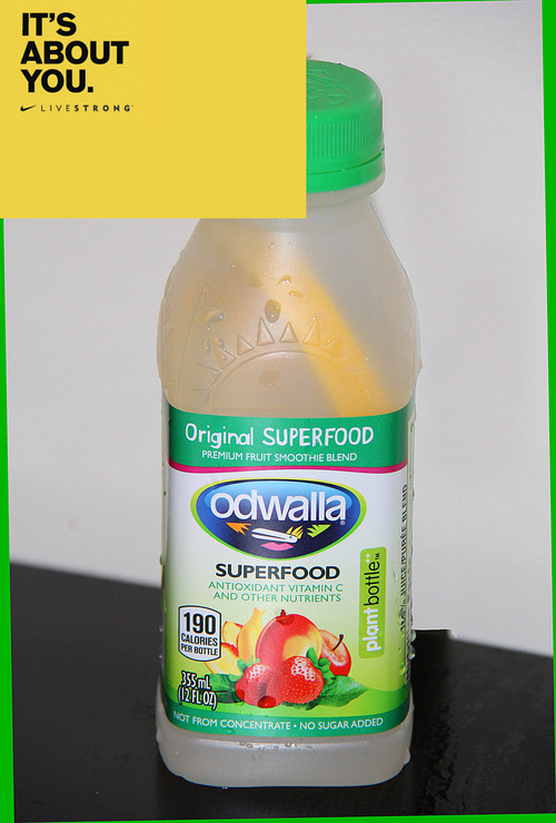 BUSHWICK tap water in an ODWALLA superfood (What’s in those artists water% This) Also there’s a LIVESTRONG bracelet inside the water bottle, 2012