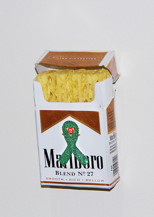 dean & deluca low calorie snack inside Marlboro box w/ Cerebral Palsy Tissue/Organ Kidney Cancer Green Ribbon Glittery Sticker (Ethical) 1/2, 2012