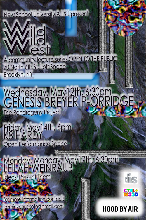 Genesis Breyer P-Orridge will be presenting a lecture based on he/r most recent endeavor in collaboration with he/r partner Lady Jaye Breyer P-Orridge entitled The Pandrogeny Project. In this, s/he discusses the aesthetics of body modification, conceptual behaviour patterns and theories based on he/r cut-up methods involving the human being, along side parallels of cultural engineering by using one’s own art and body as a vehicle for change. www.genesisbreyerporridge.com/