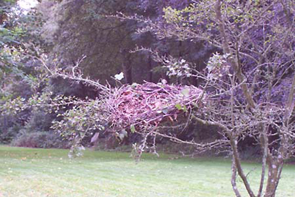 It was supposed to be an extra large bird’s nest that farted when you walked by it. Or rather fart noises were supposed to come out of it when people passed by. On the day Trine was to present her project for the “site specific” assignment on the Krabbesholm grounds, it rained miserably. She didn’t want to put her boom box, playing the CD with the recording of farts, out in the nest in the soaking rain, and we didn’t want to stand out there in the wet mess to critique it. Trine was bummed. She’d worked for a couple weeks collecting weeds, twigs and sticks, weaving them into this giant nest, that she’d set in this small tree. She’d spent weeks researching farts and recording them. The nest was becoming waterlogged and was beginning to weigh on the tree, and make it droop. She’d pulled an all-nighter and was getting upset, and we discussed other options. Nobody in the class knew this nest-sculpture also had a sound component. What Trine decided to do was have us sit in a group and face out the sliding window-door at the wet nest sagging in the tree. It was looking like it was about to fall over. She didn’t want us to watch what she was doing behind us. So, as we — wearing black bandit masks from another student’s project — stared at the tree, she fumbled around behind us, plugging in the boom box and pressed play. The sound of long wet, disgusting farts shot out of the speakers and filled the room as we stared at the pathetic nest. Almost the same instant the sound of fart hit our ears we all started laughing. We laughed uncontrollably. One woman was laughing so hysterically, that she fell over and started slapping the floor. She picked herself up after a moment, and staggered out of the room, holding her side and nearly tripping over chairs –as if drunk and needing to throw up. It wasn’t simply the sound of farts that prompted this kind of laughter. It was the combination of collective crit-preparation, sleep-depravation, and the awareness of the earnest work put into this project, coupled with the awareness of the ridiculousness of the situation where we were gathered, looking out this window, imagining these farts were somehow coming out of the nest, which was about to fall out of a little tree 50 yards away. This type of special moment is a kind of occurrence in art school that those who have been through it can relate to. The collective sleep deprived madness which fuels strange events that has left many an art student and teacher with a certain feeling that they have just experienced something rare that has not likely happened before, and will never happen again.