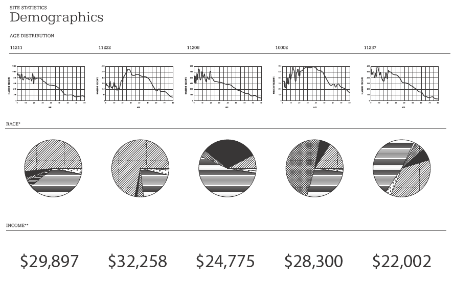 The proximity of these different types of urban systems gives rise to the second characteristic condition of the site: a diverse set of inhabitants made up of distinct groups. Currently, the site consists of a stubborn population that can be broken into three types: hipsters, Hasidic Jews, and Hispanics. Each has not only different age distributions, households, spending patterns, and racial makeup but also very separate neighborhoods and buildings. However, they all share the urban circulation spaces.